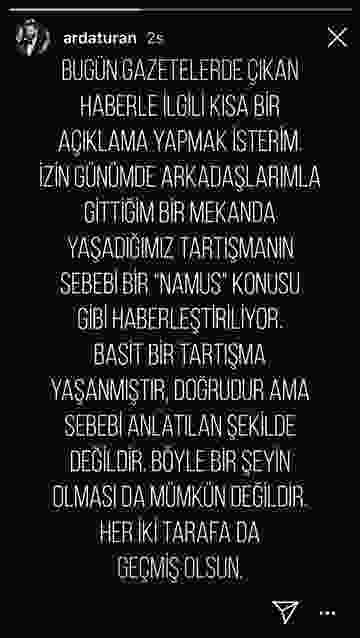 “Bugün gazetelerde çıkan haberle ilgili kısa bir açıklama yapmak isterim. İzin günümde arkadaşlarımla gittiğim bir mekanda yaşadığımız tartışmanın sebebi bir “namus” konusu gibi haberleştiriliyor. Basit bir tartışma yaşanmıştır, doğrudur ama sebebi anlatılan şekilde değildir. Böyle bir şeyin olması da mümkün değildir. Her iki tarafa da geçmiş olsun.”