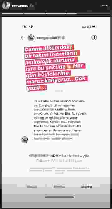 Son günlerde yurt dışında hayran kitlesinin yoğun ilgisine maruz kalan ve bu tarz haberlerle gündeme gelen Can Yaman, Türkiye’den bir takipçisinin attığı mesajı sosyal medya hesabından ifşa etti. Yurt dışında gördüğü ilgiye ülkesinde inanılmamasına sinirlenen oyuncu, paylaşımına “Canım ülkemdeki birtakım insanların psikolojik durumu işte bu şekilde. Her gün böylelerine maruz kalıyoruz. Çok yazık…” notunu düştü.