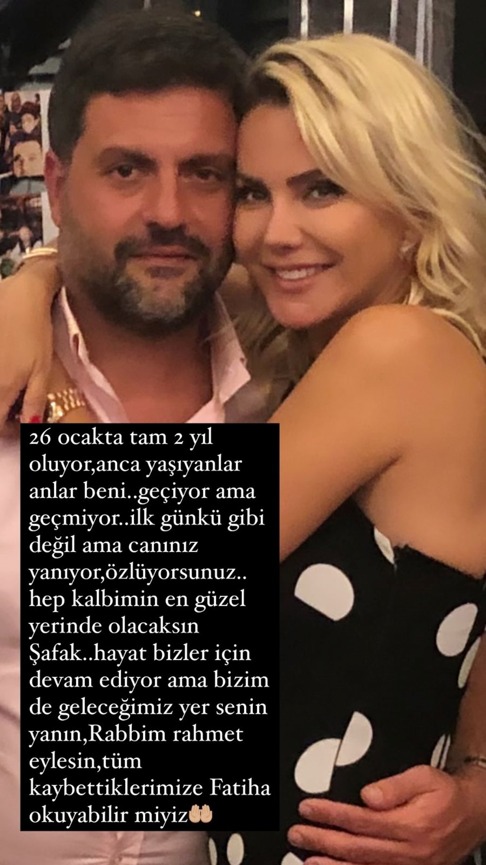 “26 Ocak’ta tam iki yıl oluyor. Ancak yaşayanlar anlar beni. Geçiyor ama geçmiyor. İlk günkü gibi değil ama özlüyorsunuz… Hep kalbimin en güzel yerinde olacaksın Şafak… Hayat bizler için devam ediyor ama bizim de geleceğimiz yer senin yanın. Rabbim rahmet eylesin. Tüm kaybettiklerimize Fatiha Suresi okuyabilir miyiz?”