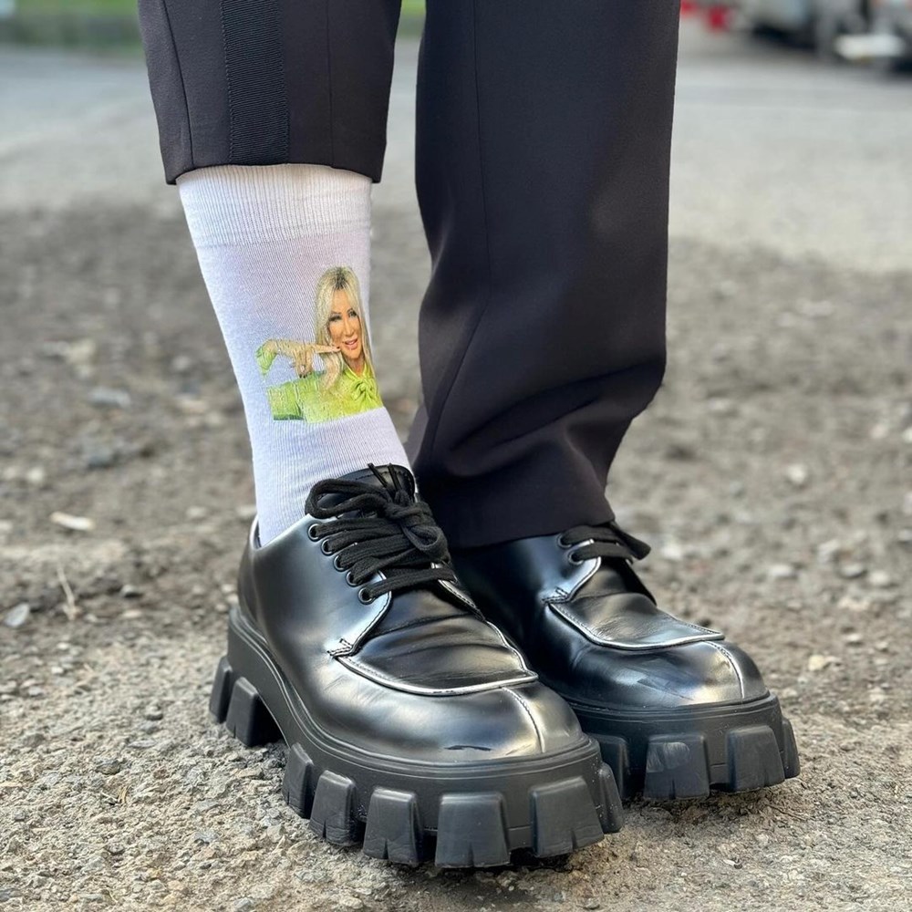Arıkan’ın sahnede giydiği Seda Sayan baskılı çorapları da beğenildi.