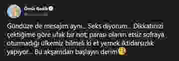Gedik bu kez de “Gündüze de mesajım aynı… Dikkatinizi çektiğime göre ufak bir not; parası olanın etsiz sofraya oturmadığı ülkemiz bilmeli ki et yemek iktidarsızlık yapıyor… Bu akşamdan başlayın derim” mesajını paylaştı.