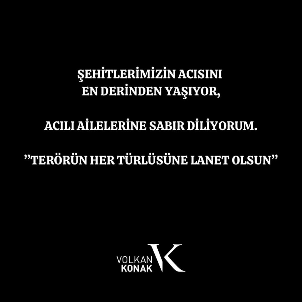 Volkan Konak da “Şehitlerimiz acısını en derinden yaşıyor, acılı ailelerine sabır diliyorum. Terörün her türlüsüne lanet olsun” paylaşımında bulundu.